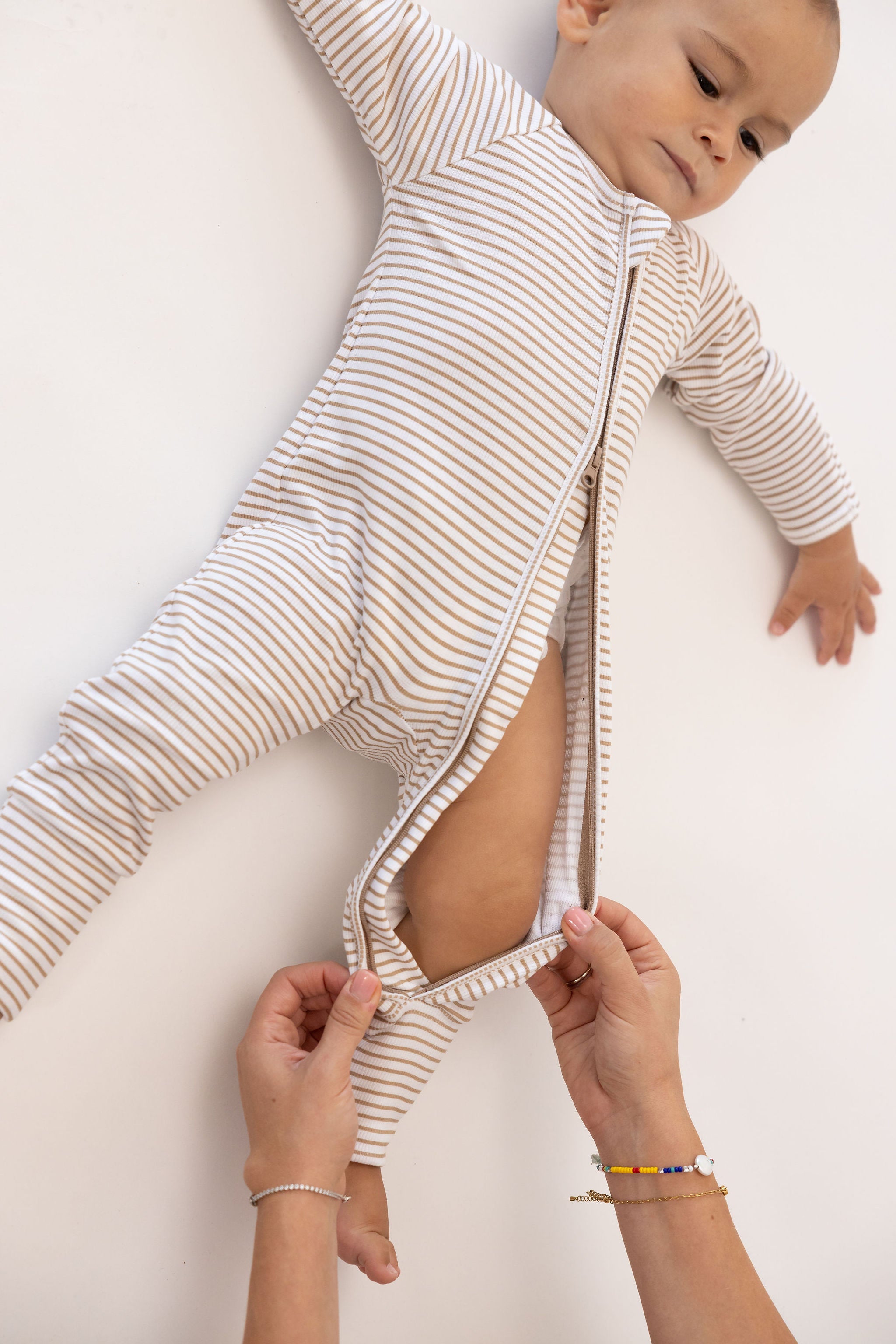 הרוכסן הדו כיווני הופך את זמן ההחתלה לסופר מהיר וקל! יש לרכוס מלמעלה בעת ההלבשה, ולסגור מלמטה שמחליפים חיתול (וכך לא חושפים את הבטן של התינוק)