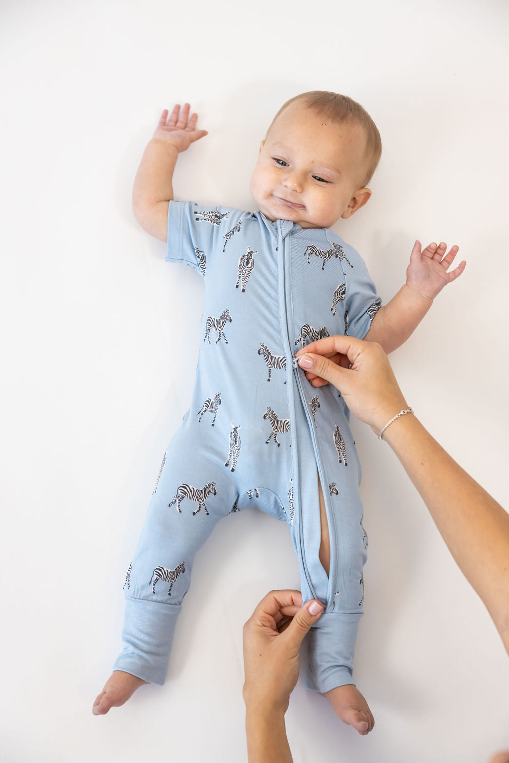הרוכסן הדו כיווני הופך את זמן ההחתלה לסופר מהיר וקל! יש לרכוס מלמעלה בעת ההלבשה, ולסגור מלמטה שמחליפים חיתול (וכך לא חושפים את הבטן של התינוק)