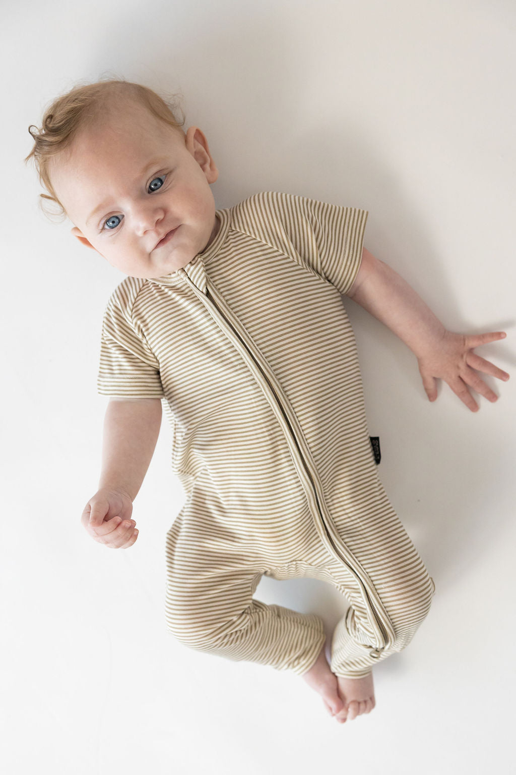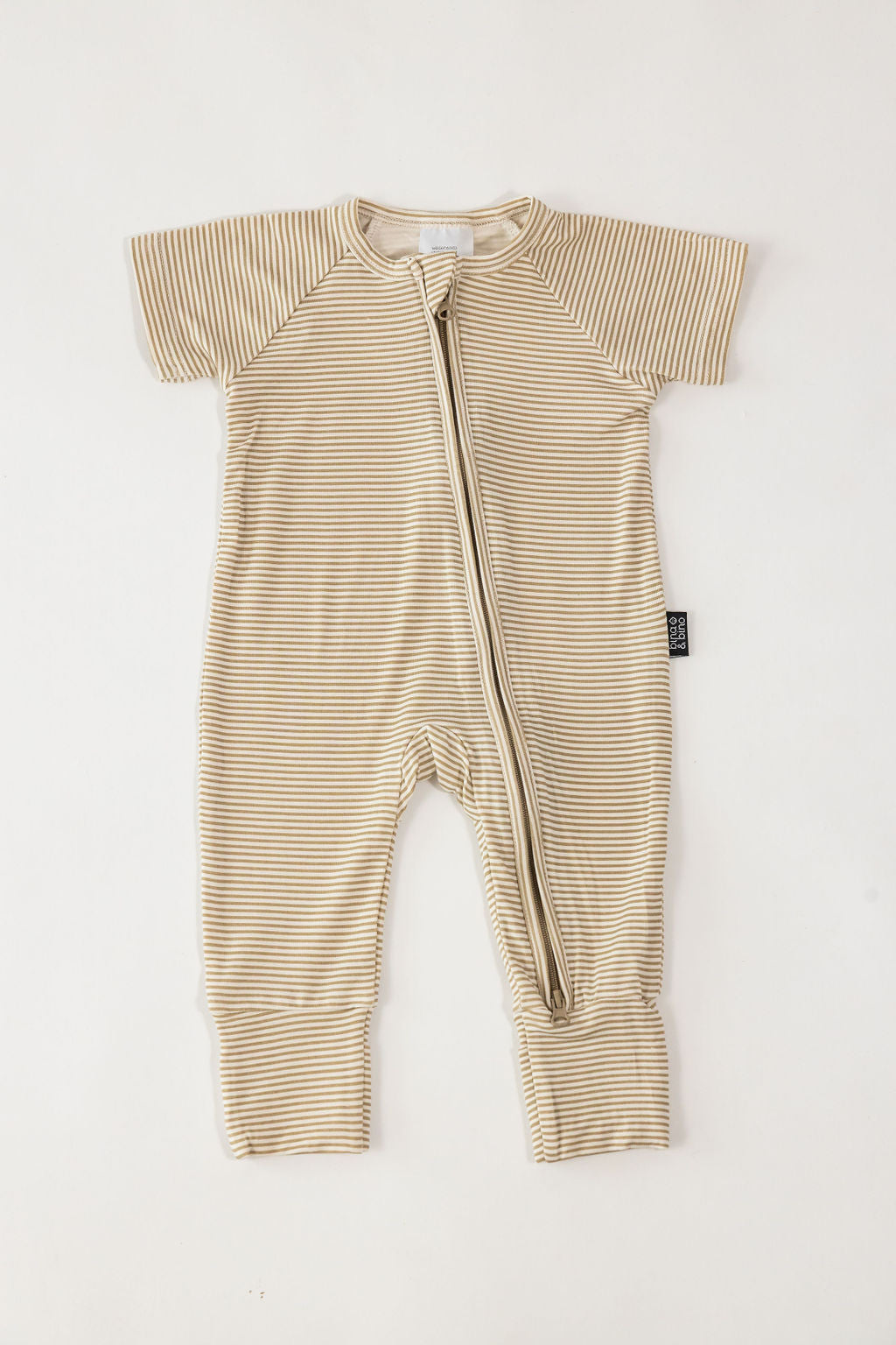 אוברול רוכסן דו כיווני עם שרוול קצר מבד במבוק // BROWN STRIPE SHORT